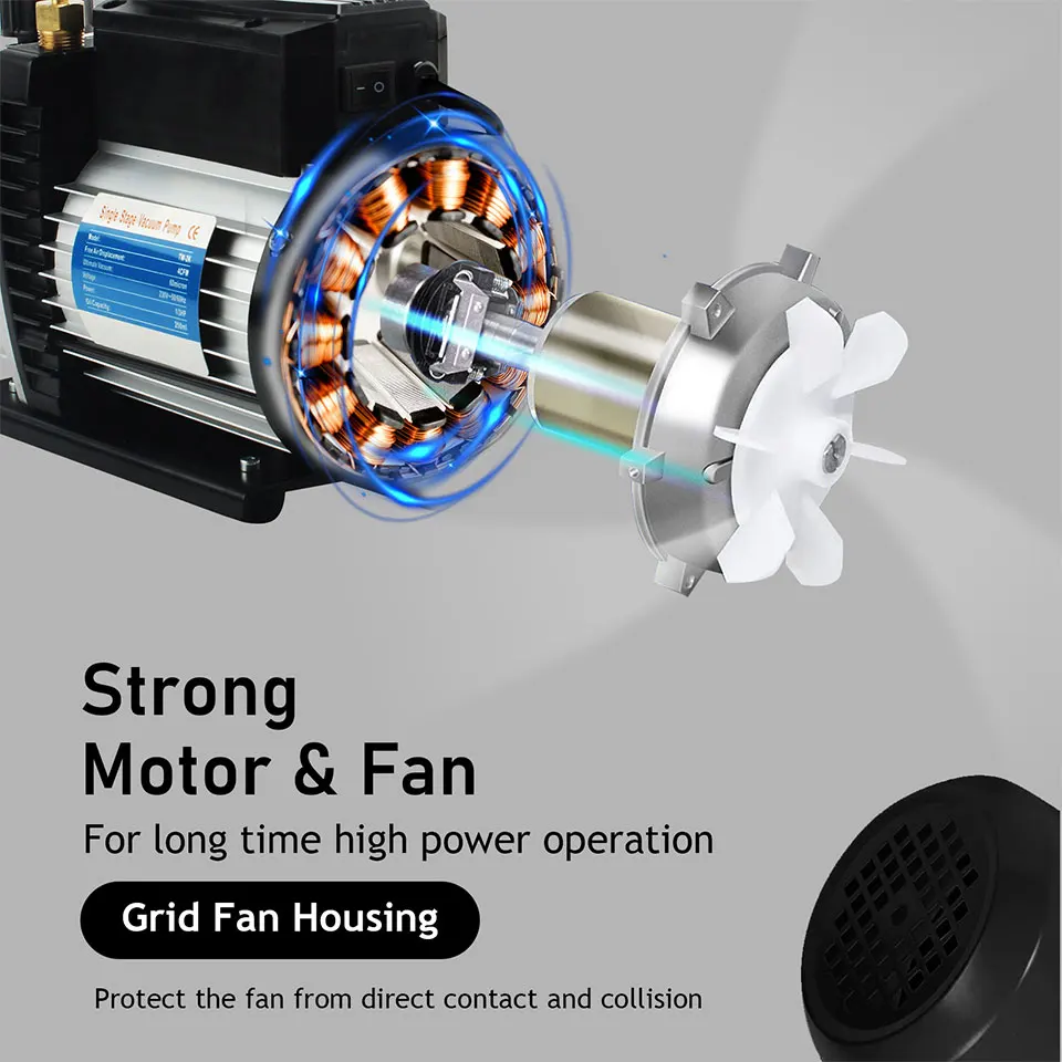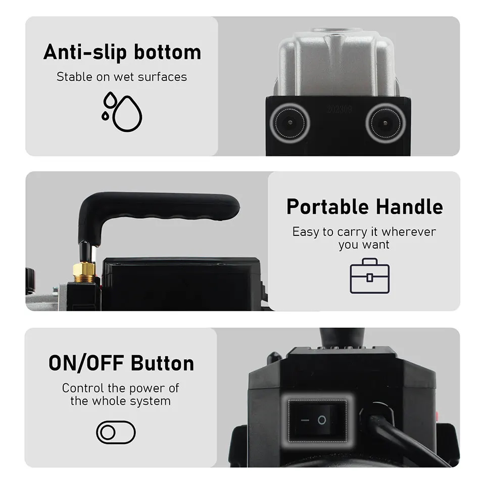 Capacidade de vácuo de alto desempenho: Com uma potente classificação de 4,8 CFM (pés cúbicos por minuto), este kit de bomba de vácuo evacua o ar e a umidade dos sistemas A/C e HVAC de forma rápida e eficiente, garantindo carregamento ideal de refrigerante e desempenho do sistema.Seu design de alto desempenho economiza tempo e esforço durante tarefas de reparo e manutenção.